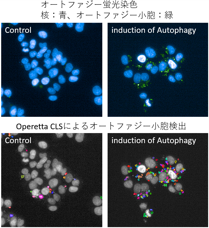 弊社では細胞ベースでの高速イメージング解析を可能とするハイコンテントスクリーニング機器であるOperetta CLSおよびOpera Phenix Plusを導入しており、生細胞のオートファジー活性状態を高精度かつハイスループットに解析することができます。