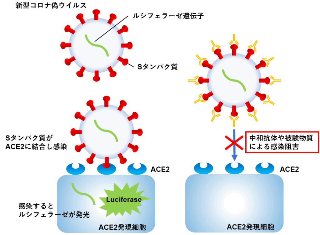 本試験では、SARS-CoV2のSタンパク質を持つ偽ウイルス及びACE2発現細胞を用いて、被験物質の抗コロナウイルス効果を検証します。オミクロン株などの変異株に対する評価も可能です。