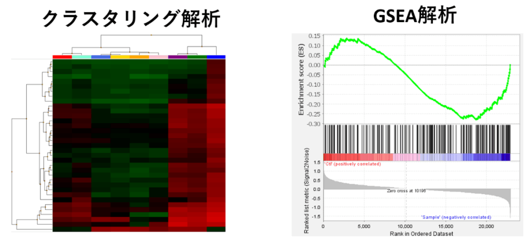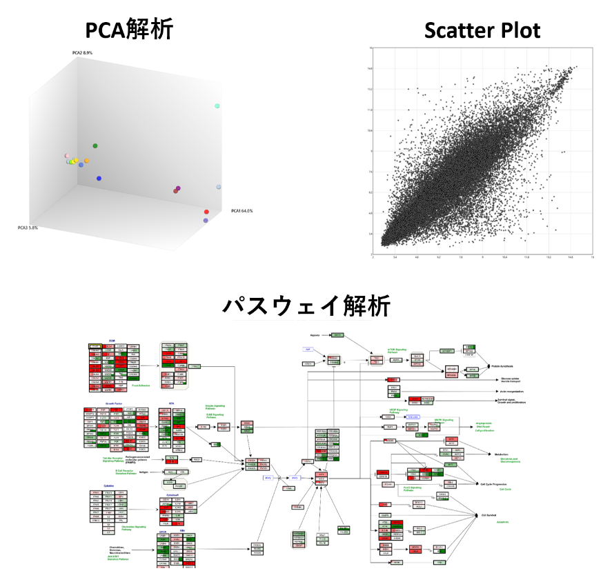 | 解析項目 | PCA解析 Scatter Plot パスウェイ解析 クラスタリング解析 GSEA解析 など |