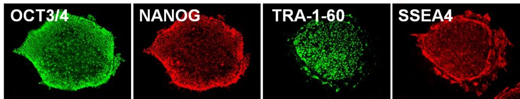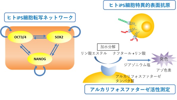 OCT3/4、NANOG、SOX2といった特定の転写因子を中心とした転写因子ネットワークにより、ヒトiPS細胞では未分化な状態を維持していると考えられています。また、未分化状態のiPS細胞では、SSEA-4、TRA-1-60、TRA-1-81といった表面抗原や、アルカリフォスファターゼ酵素を高発現していることが知られています。