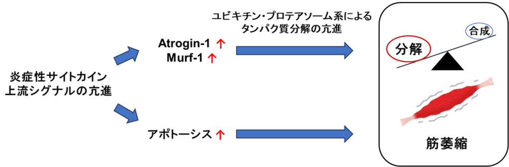 筋肉は、筋芽細胞からの分化による筋合成と、ユビキチン・プロテアソーム系による筋分解のバランスにより適切な量が保たれています。老化や各種疾患によりそのバランスが崩れ、筋分解が優位になってしまうと筋萎縮による筋肉量低下が引き起こされます。筋肉量の低下は日常生活に大きな影響を及ぼすことから、筋萎縮への対策は生活の質の観点からも重要です。
