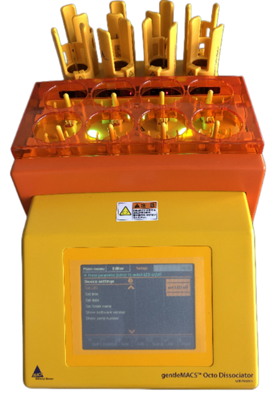 弊社では組織分散・破砕装置として、Miltenyi Biotec社のgentleMACS Octo Dissociator with Heatersを導入しています。これにより、複数サンプルの同時処理が難しい組織の分散や破砕を、最大8サンプルまで同時に処理することが可能です。さらに、本モデルは自動で酵素処理も行われ、各組織に対して最適化されたプログラムと専用チューブを使用することで、全工程を自動かつ無菌的に実施できます。手技や処理時間等によるブレも少なく、再現性良く、品質の高い細胞懸濁液やホモジネートを得ることができます。